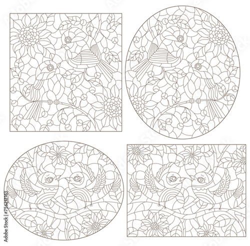 A set of contour illustrations in the style of stained glass with cute birds on branches and flowers, dark contours on a white background
