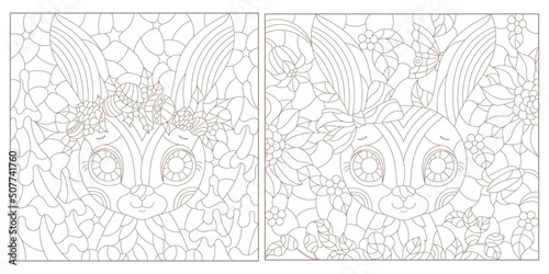 A set of contour illustrations in the style of stained glass with cute portraits of rabbits, dark contours on a white background