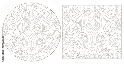 A set of contour illustrations in the style of stained glass with portraits of cute cartoon rabbits on a background of flowers
