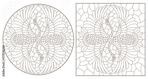A set of contour illustrations in the style of stained glass with swans flying birds, animals isolated on a white background