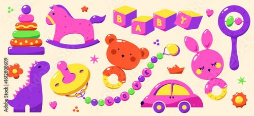 A set of cute children toys and elements painted bright neon colors. The package contains baby rattles, pyramid, car, pacifier, dinosaur and cubes.