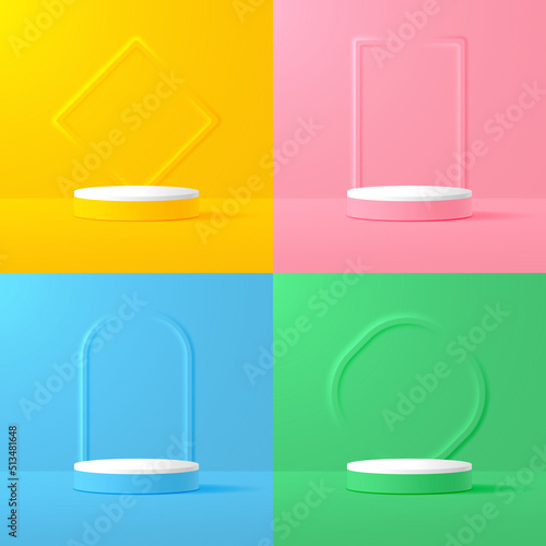 A set of cylindrical podiums of pink blue yellow and green against the background of relief forms of geometric shapes.