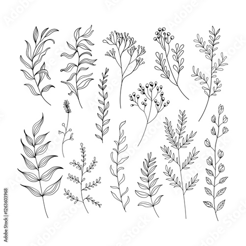 A set of detailed botanical illustrations with hand-drawn wildflowers and leaves. Perfect for patterns, invitations, packaging, and elegant artwork.