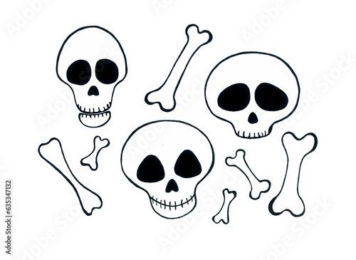 A set of different bones and three different skulls. They are drawn with a black outline. Isolated on white background. All are stylized in different ways. Funny and cute images for Halloween.