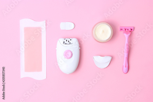a set of different means for epilation on a colored background. Removal of unwanted hair. Modern epilator, wax strips, razor. Minimalism, top view. flatlay