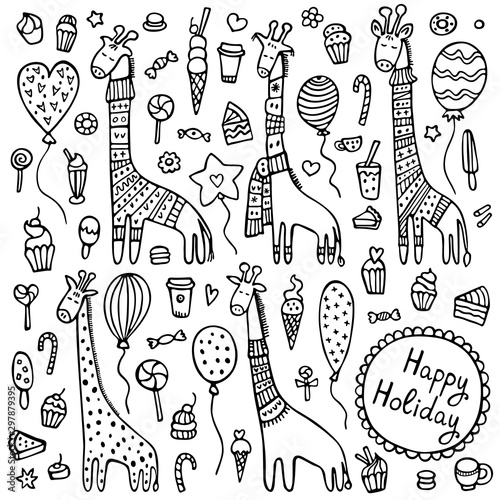 A set of doodle giraffes with knitted scarves and warm winter sweaters surrounded by balloons, cakes, candies, and other sweet things. Cute hand drawn vector illustration.