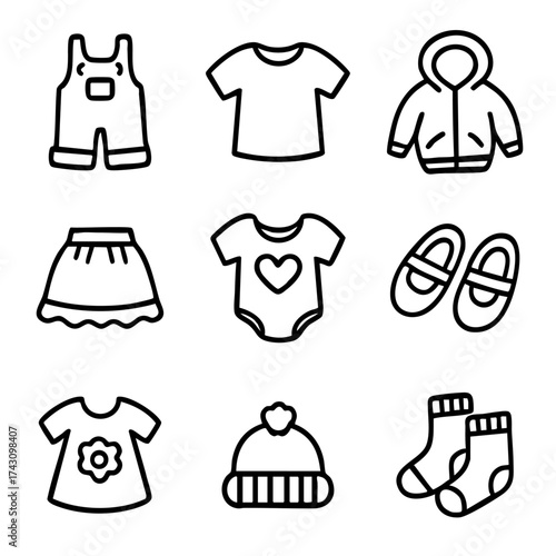 A set of doodle line icons featuring baby and toddler clothes including shirts, onesies, hats, socks, skirts, and shoes