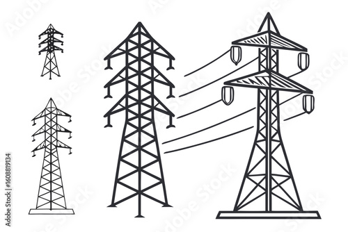 A set of electricity pylon drawings show the different types of power line transmission towers isolated on white background