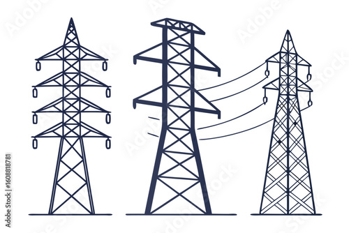 A set of electricity pylons and power lines isolated on white background, showcasing energy transmission infrastructure