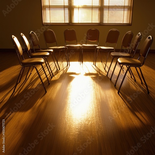 A set of empty chairs arranged in a circle, illuminated by warm sunlight streaming through the windows.
