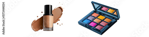 A set of foundation bottle and colorful eyeshadow palette – transparent background.