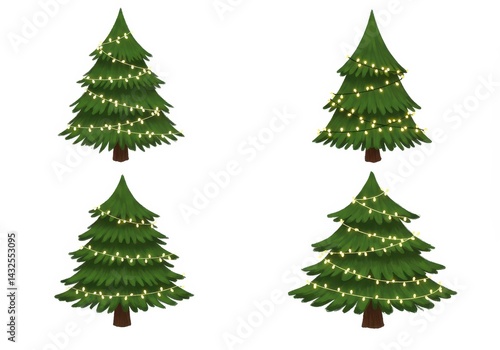 A set of four christmas trees decorated with string lights on a white background, festive and bright