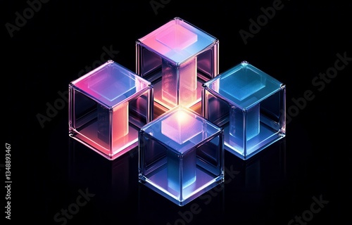 A set of four cubes in a row, each with a different color. The cubes are made of glass and are arranged in a way that they appear to be stacked on top of each other. The colors of the cubes are purple