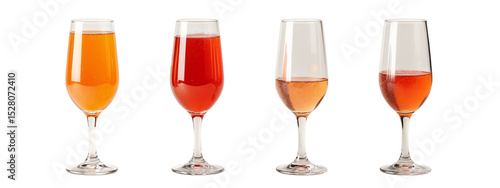 A set of four wine glasses filled with different colored drinks.