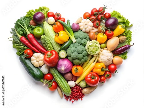 a set of fresh vegetables laid out in the shape of a heart on a white background
