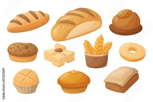 a set of freshly baked and cooked baked goods on a white background