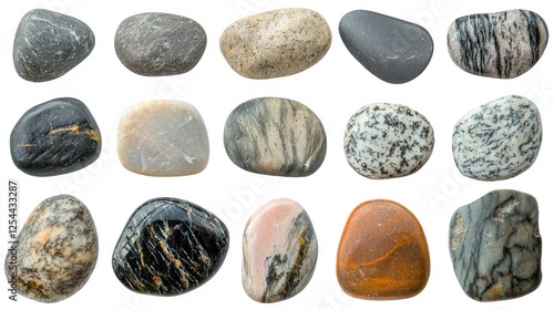 A set of gem-like stones and smooth rocks displayed on a white background.