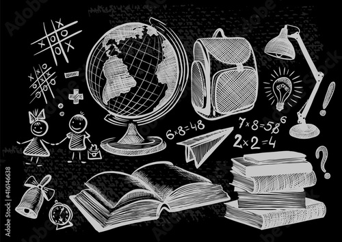 A set of graphic school subjects. Chalk drawing on a school board. Vector illustration