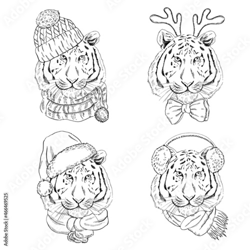 A set of hand-drawn portraits of a tiger in knitted, Christmas hats and scarves. Vintage vector illustration. New Year and Christmas illustration.