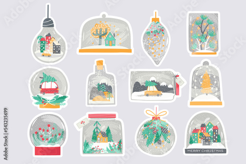 a set of hand-drawn snow globes stickers. Christmas, hurtelitsa, holidays. vector flat illustration.