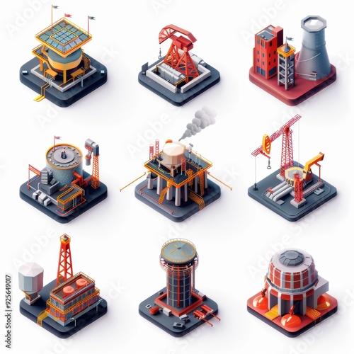 A set of industrial buildings with a variety of shapes and sizes. The buildings are all made of different materials and are located in different areas. Some of the buildings have red roofs