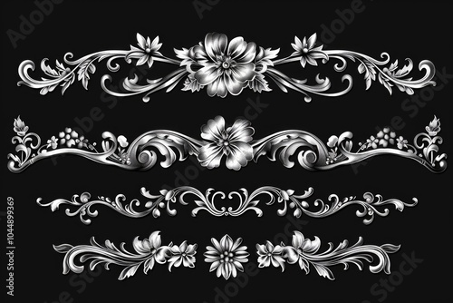 A set of intricate silver floral design elements on a black background, ideal for use in luxury branding and packaging designs