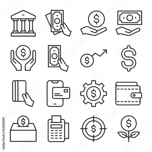 A set of money related icons including a bank, a wallet, a phone, a calculator