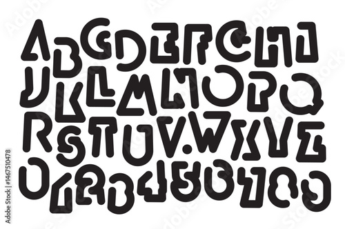 A set of outline letters with a simple, thick, geometric shape. Black and white font with a sporty, dynamic, modern theme. Latin alphabet letters and numbers. No AI used