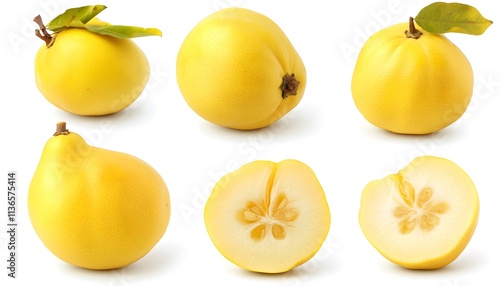 A set of Quince isolated on a white background. It includes whole,halved and slice, all with full depth of field. --ar 7:4