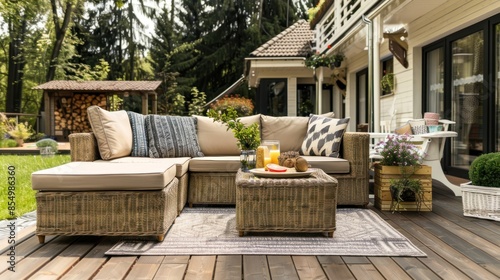 A set of rattan sofas with beige cushions is arranged together on a balcony in a beautiful garden.