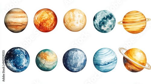 A set of round space planets of the solar system and Earth,sun the Moon,solar system objects for educational projects,hand painted planets and moons, satellites,watercolor painting in galaxy.