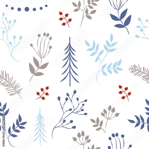 A set of simple Christmas patterns. color illustration of Christmas trees, snowflakes, leaves, branches, cranberries, berries. flat design. winter illustration