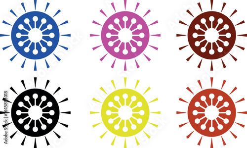 A set of six colorful circular designs with radial lines and inner circles on a white background design