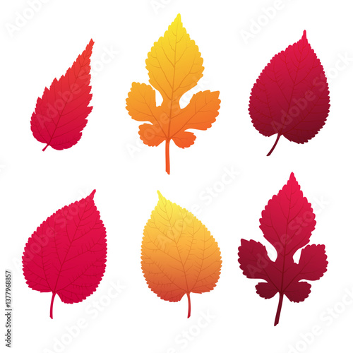 A set of six detailed autumn leaves in vibrant autumn colors, isolated on a white background. Perfect for seasonal designs, nature-themed projects and fall-inspired illustrations.