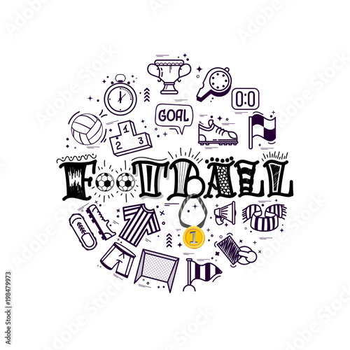 A set of soccer icons and lettering football in a circle, in a cartoon style doodle, completely handmade.