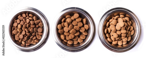 A set of three metal bowls filled with different types of dry pet food, showcasing variety and nutrition for your furry friend