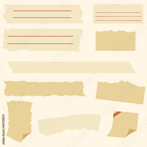 A set of torn strips of paper for notes or a notebook on a light background. A torn sheet, the edge of a scrapbook, or an empty illustration on a banner. For the design of social networks.