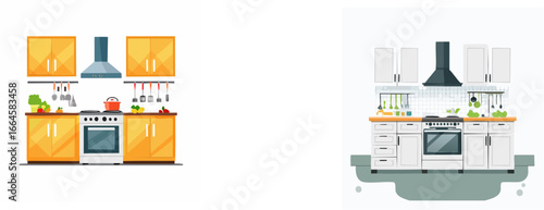 A set of two modern kitchen interior illustrations, featuring different cabinet colors, stoves, and range hoods in a flat vector style.