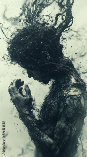 A shadowy figure covered in vines, a haunting image.