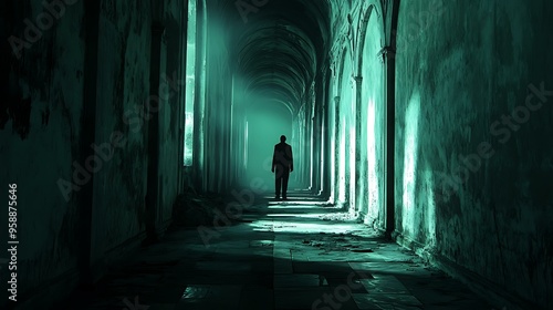 A shadowy figure standing at the end of a long, dark corridor