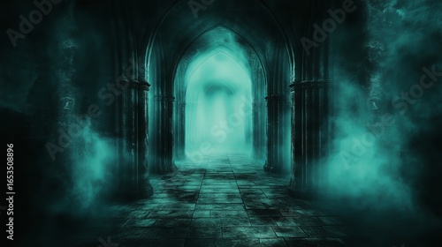 A shadowy figure stands at the end of a misty, gothic hallway, exuding eerie presence. The image captures horror, suspense, and supernatural intrigue.