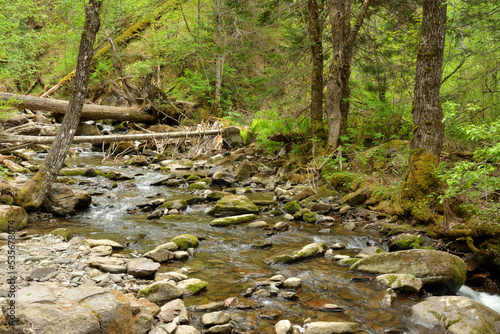 A shallow river flowing through the forest skirting rocks and fallen trees.