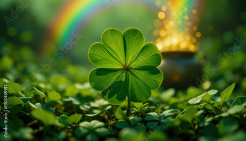 A shamrock with a rainbow and pot of gold in the background. St. Patrick's Day Concept.