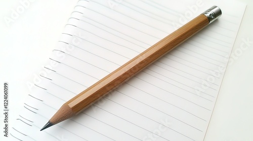 A sharpened wooden pencil rests on a spiral notebook's lined pages.