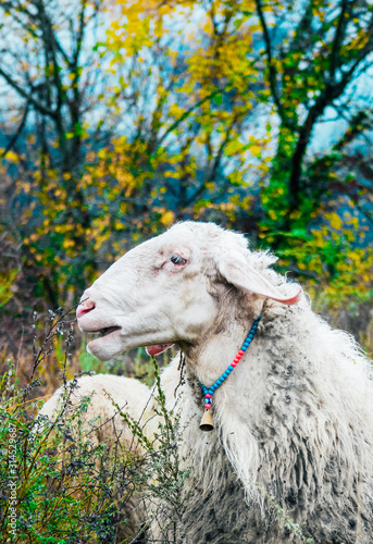 A sheep with Muslim collar and bell. Kosher meat concept.