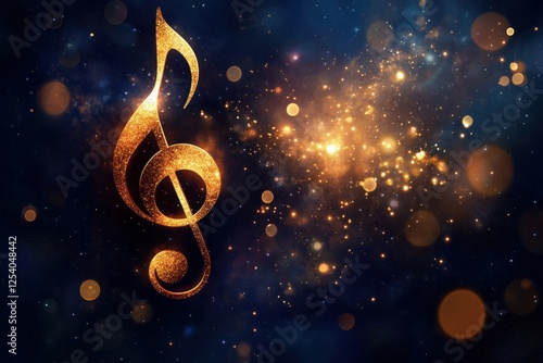 A shimmering golden musical note surrounded by sparkling lights and a dark cosmic background.