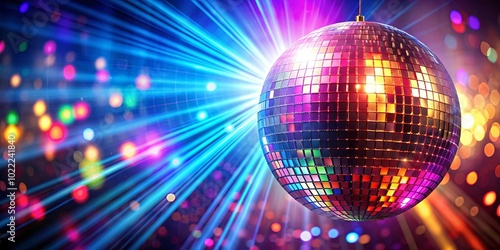 A shimmering mirrored sphere reflecting colorful beams of light against a backdrop of shimmering bokeh