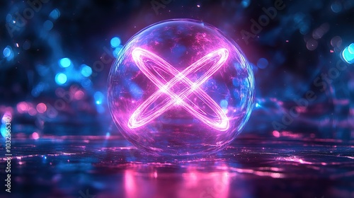 A shimmering neon globe radiating with the power nuclear logo hologram