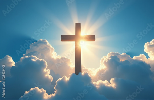A Shining Cross In Clouds On A Blue Sky Symbolizes Faith In Jesus Christ And The Second Coming Of Christ To Christians.