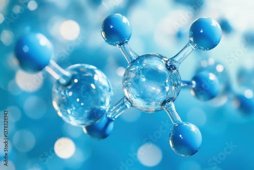 A shiny, blue molecule structure with spherical atoms and connecting bonds is visible. Ideal for science, medicine, research, or innovative technology presentations.